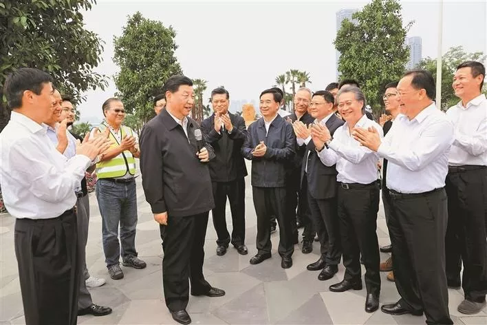 10月24日,习近平在广东自由贸易试验区深圳前海蛇口片区考察。在前海石前,习近平同前海建设者和见证者代表同话沧桑巨变。新华社记者鞠鹏摄
