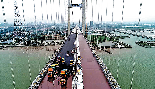 虎门二桥正在进行沥青铺装施工。