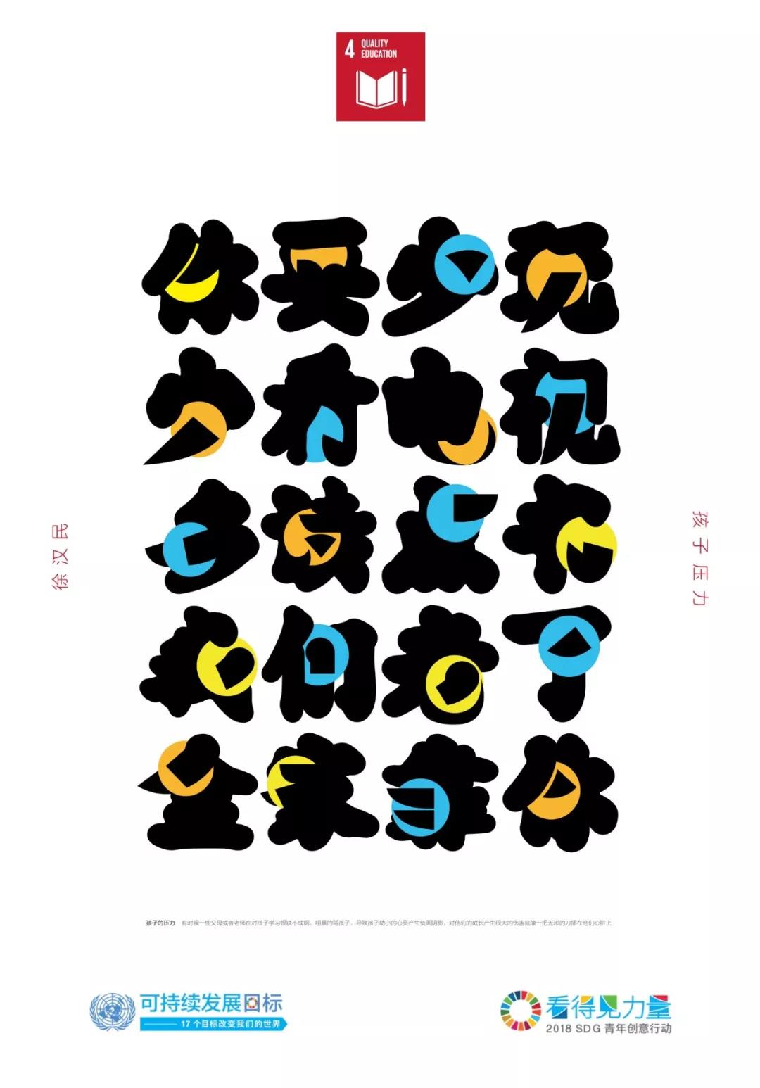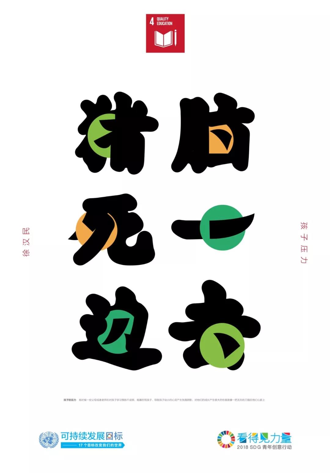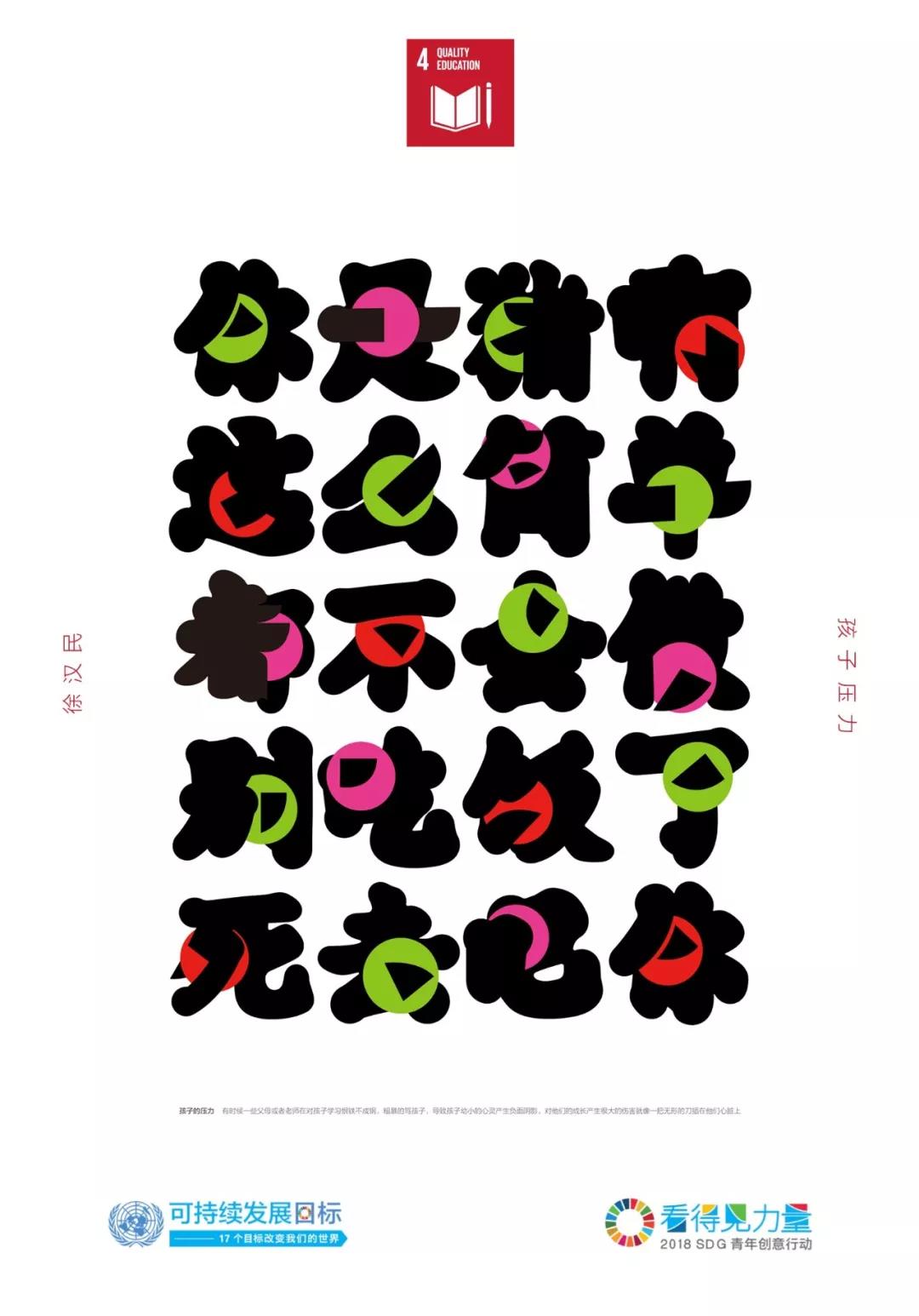 作品解释 /现在孩子的压力越来越大,导致很多孩子心理灰暗、暴力犯罪、自我封闭等现象,其中一个原因是父母期望和恨铁不成钢打骂给孩子带来沉重的压力。由此作者直接用那些语句来设计,这些字体中穿插着一个小圆点即孩子们的脑袋,他们被这些语言带来的无形压力刺痛,整个字比较圆润只有关键的地方锋利无比,就像一把无形的刀插在他们心上。