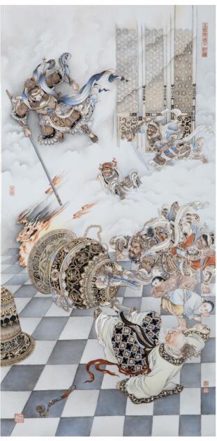顾坚瓷板画代表作再现了齐天大圣大闹天宫的经典画面(展览方 供图)