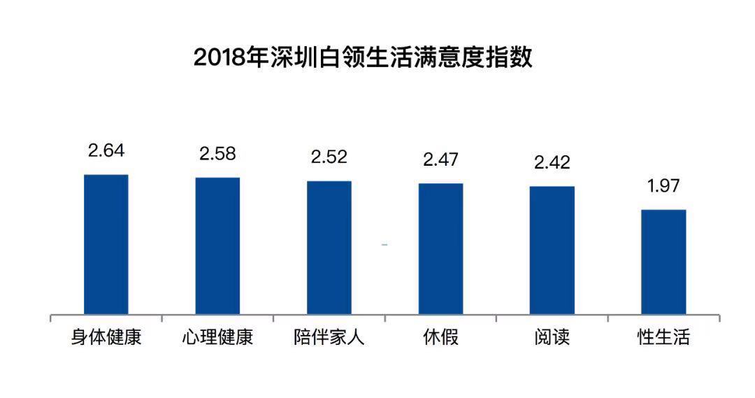 另外,根据调查,深圳白领对自己身体健康状况的满意度最高,对自己的性生活最不满意。性生活虽然是一个隐秘的话题,但是却又是决定白领生活质量很重要的一环,工作压力大、经济压力大也是深圳白领无暇恋爱,不能有太多精力经营两性关系的重要原因,如何在中间找到平衡点,需要企业和雇员一起思考。