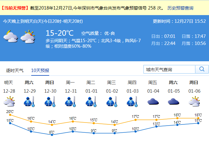 深圳市气象局预计,12月28日受冷空气前锋影响,我市多云间晴天,风力加大,沿海和高地最大阵风7-8级,气温下降,早晚清凉;29日-元月2日受冷空气主体影响,气温显著下降,天气持续寒冷,最低气温在8℃左右,伴有7-9级阵风,间中有小雨。寒冷天气将持续5-6天。