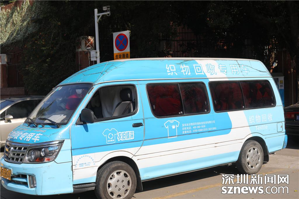 在福田区梅林一村的近停车场入口处,记者在几乎要满的织物回收箱前等待着该公司运输车辆的到来。不久后,一辆喷涂有织物回收专用车字样的面包车进入了停车场。据介绍,该车辆喷涂为政府统一要求,进行废旧织物回收的作业的车辆需要有统一的涂装。