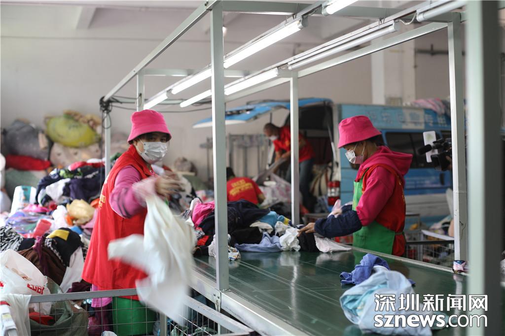 在分拣库内,有两个传送带,工作人员将分拣出来的衣服放置在分拣带上,两名工作人员在分拣带中间,背后放有多个分拣筐,通过传送带前端传递过来的衣物,工作人员快速的将衣服分为校服、外套、短袖等类别进行分拣工作,并放置在相应的分拣筐中。