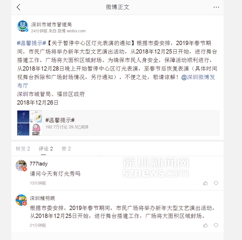深圳灯光秀12月28日起暂停表演 春节后再恢复