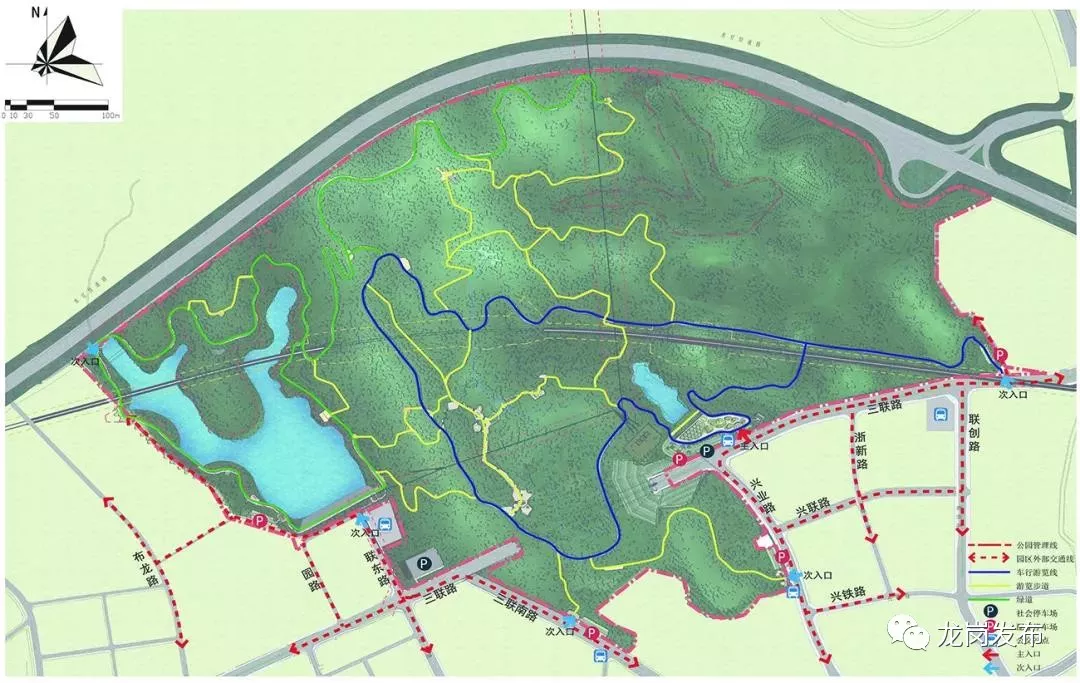 公园内的道路系统路可分为车行道、休闲步道、登山道和自行车道。