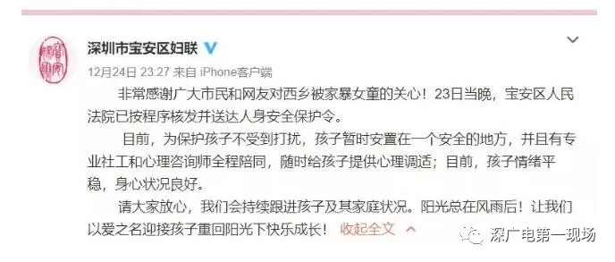 而在稍早前的12月24号,宝安西乡街道办发布的情况通报:宝安区人民法院于23号晚已经签发人身安全保护令,目前已经送达当事人及辖区派出所。