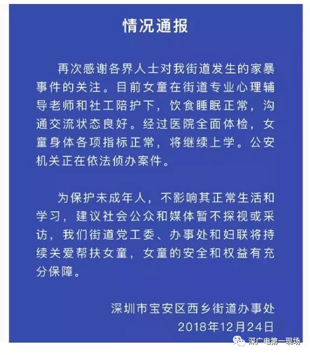 12月24日晚,深圳市宝安区西乡街道办通报表示:目前女童在街道专业心理辅导老师和社工陪护下,饮食睡眠正常,沟通交流状态良好。经过医院全面体检,女童身体各项指标正常,将继续上学。