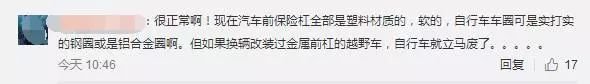 还有有不少网友指出,"很正常啊!现在汽车前保险杠全部是塑料材质的,软的,自行车车圈可是实打实的钢圈或是铝合金圈啊。但如果换辆改装过金属前杠的越野车,自行车就立马废了""如果把这些拿来冷嘲热讽,鼓励所有汽车制造商弄成实打实的硬铁,那么发生碰撞的时候就笑不出了""对一个局部点进行冲击。力度是非常大的,换其他大部分车都一样"。