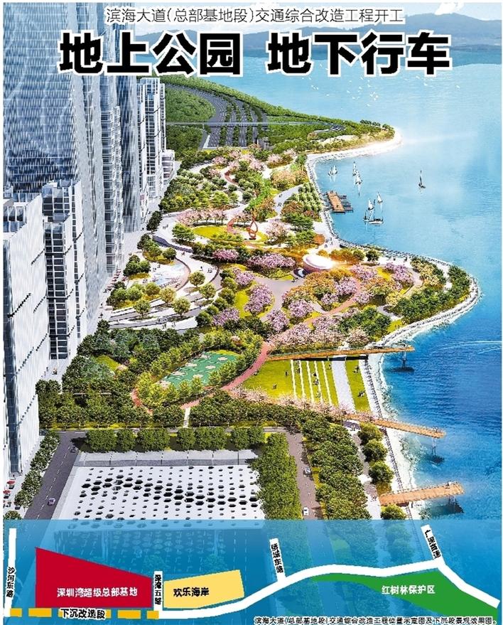 据介绍,滨海大道下沉后,地面将释放出约10万平方米的面积,能够和深圳湾公园连为一体,将成为深圳另一个重要的公共活动空间。同时配套规划建设的还有地面公园、地下公共停车设施、人行过街设施、公交首末站等,将大幅提升片区的公交可达性和拓展慢行空间,能市民提供多层次的公共与商业配套服务选择。