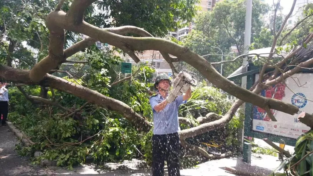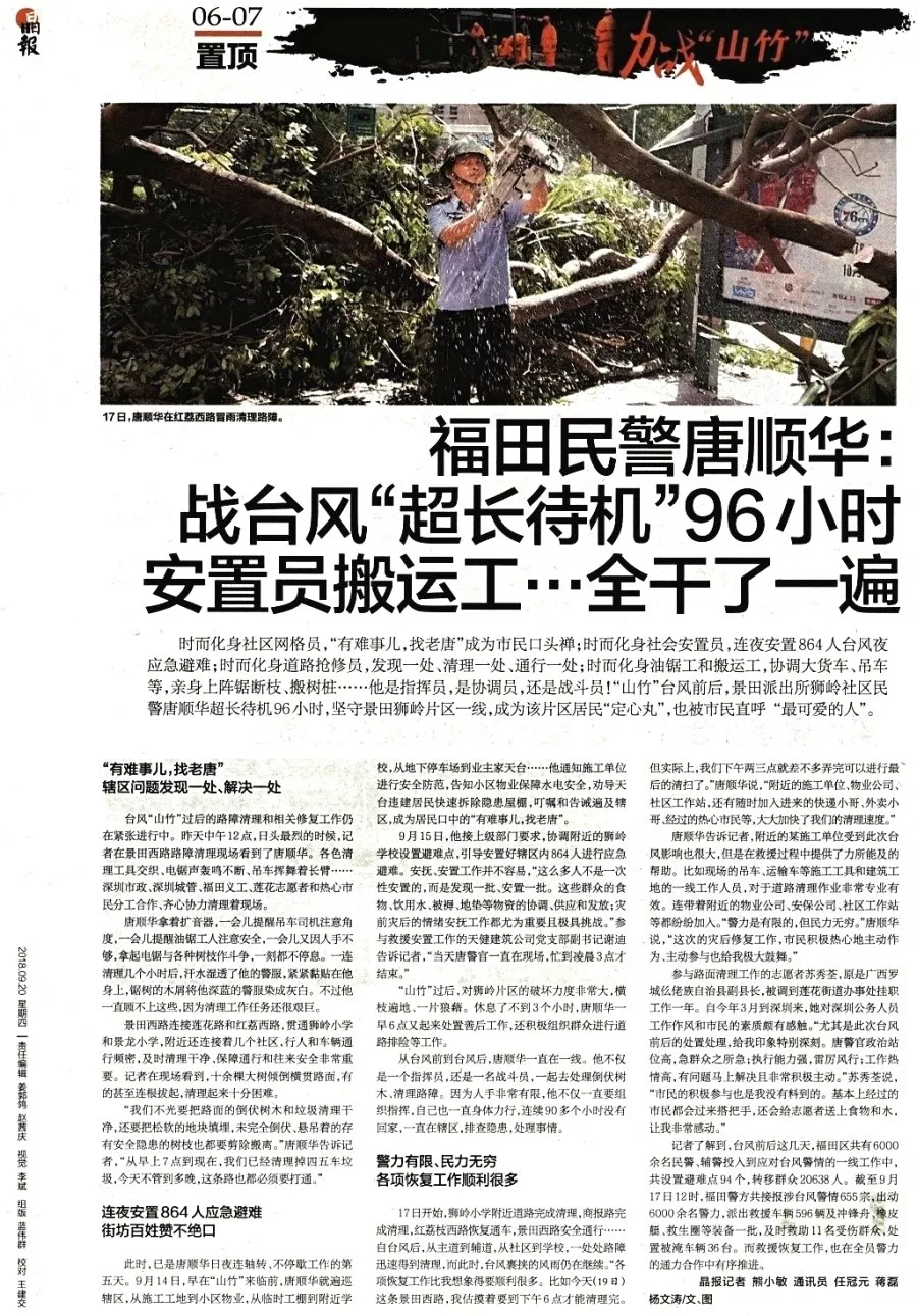 ★★深圳遭遇三十年来最强台风“山竹”袭击,景田派出所民警唐顺华坚守景田狮岭片区,顶风冒雨抢险救灾,处理倒伏树木、清理路障,连续90多个小时没有回家。