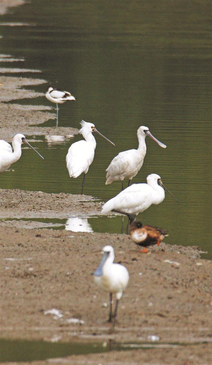 中午12时许,福田红树林国家级保护区的2号鱼塘里,已经聚集了45只珍稀候鸟——黑脸琵鹭。在它们身边,还有数百只反嘴鹬、针尾鸭、绿翅鸭、琵嘴鸭、赤颈鸭、青脚鹬等候鸟在水中忙着觅食。