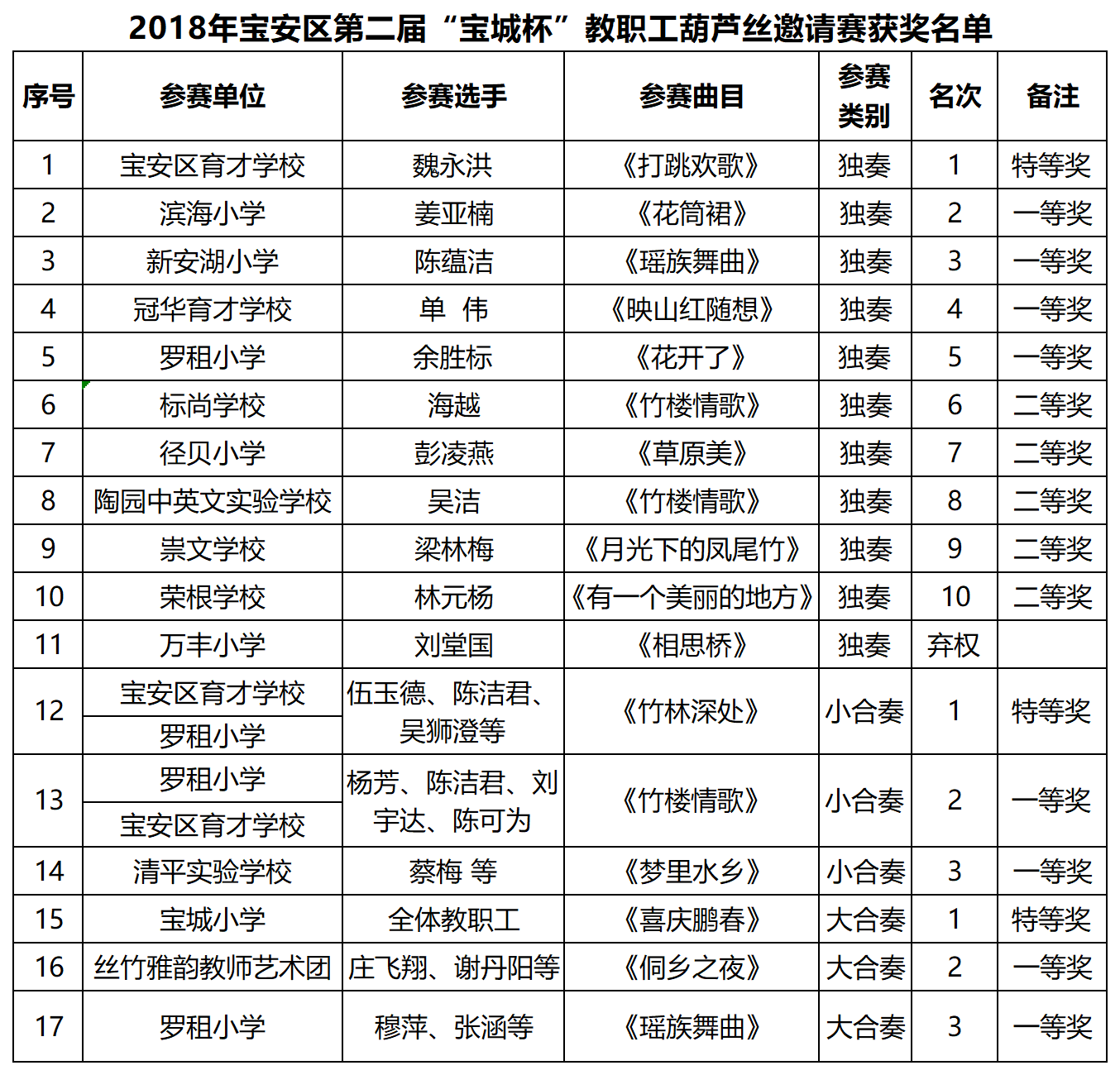 深圳新闻网讯(记者 贺靛婧)岁月悠远,剪不断绵绵的教育梦,芦声悠扬,诉不尽深深的教育缘。12月29日,宝安教育工会主办,宝城小学承办的宝安区第二届“宝城杯”教职工葫芦丝邀请赛在宝城小学倾情上演。宝安区教育局副局长罗辉,宝安区教育局调研员、区教育工会主席陈国新,宝安区教育科学研究院院长彭茂发,宝安区公共文化服务中心主任刘明军出席活动并为获奖单位颁奖。