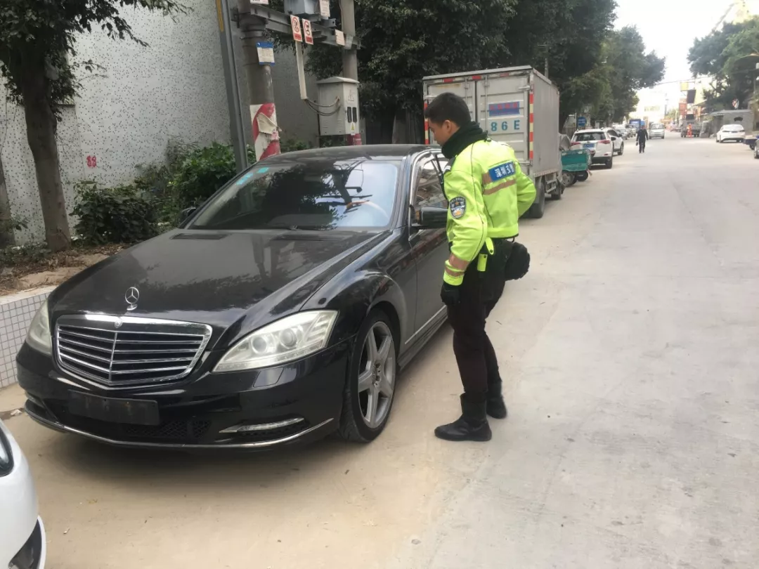 2018年12月28日下午17时左右,深圳交警铁骑队员巡逻至宝安沙井洋下大道附近的修理厂时,发现一辆黑色奔驰未悬挂号牌。