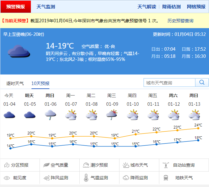 深圳市气象局预计,今日气温14-18℃;5日下午到9日受弱冷空气影响,气温小幅波动,早晚有轻雾,间中有小雨,部分时间可见阳光。
