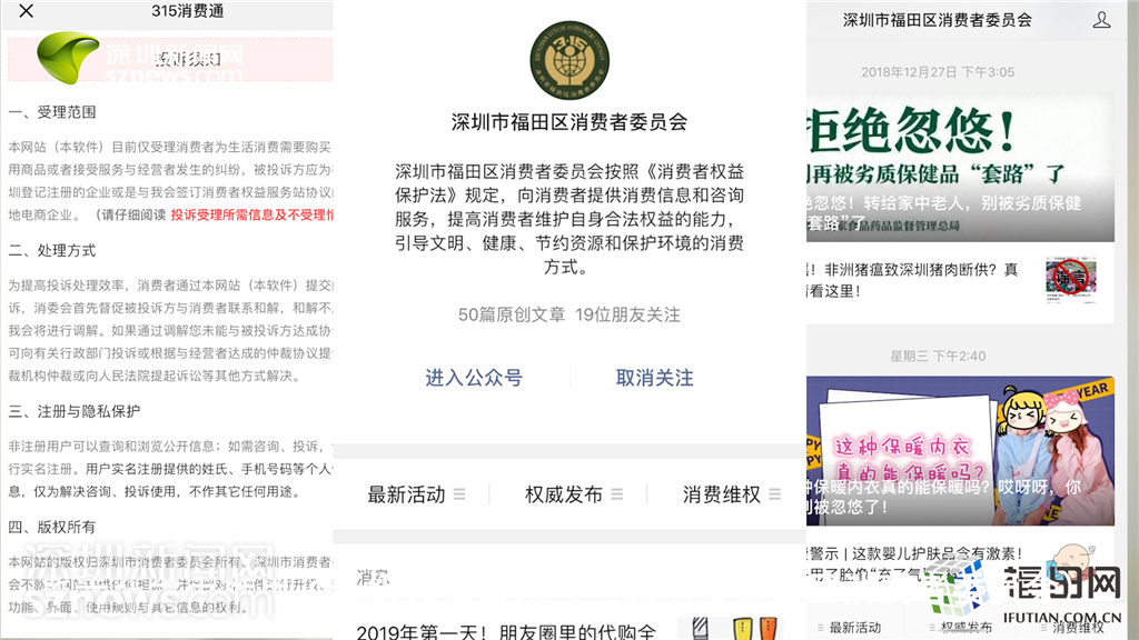 福田区消委会微信公众号界面,包含消费维权投诉、发布消费警示等内容。