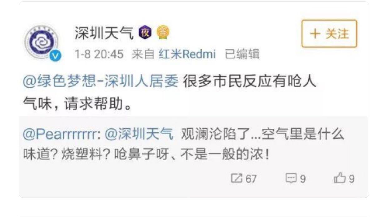 本秀儿最近嗅到深圳部分地区空气里有呛人气味