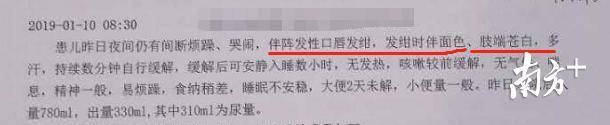 据孙小姐回忆,1月5日下午,孩子出现发烧症状,当时吃了药以后,不到一天半的时间就已经退烧了,体温恢复正常。但在1月8日,孩子出现咳嗽、眼睛浮肿的症状,孙小姐就带着孩子去深圳市儿童医院拿了点药,“但吃了药以后,孩子咳嗽不见好转,听起来越来越严重,有点喘不过气的感觉。”