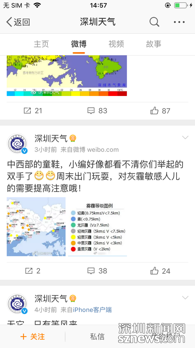 1月12日中午,深圳天气微博发布预警,图中橙色圆点所在的深圳多个片区发生中度灰霾