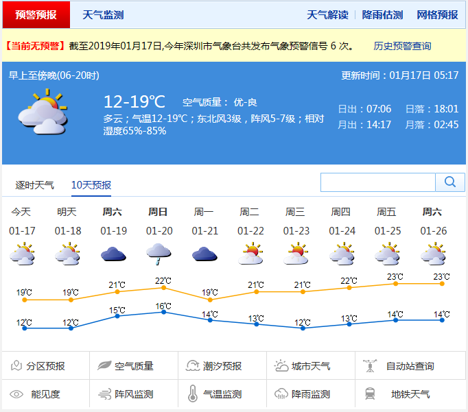 深圳新闻网2019年1月17日讯(记者 刘婷)受冷空气和切变线影响,深圳1月16日阴天有小雨,天气明显转凉。今日白天,阴天转多云可见阳光。早晚最低气温徘徊在12 ℃左右,中午前后最高气温在19 ℃左右,早晚较冷,注意添衣保暖。