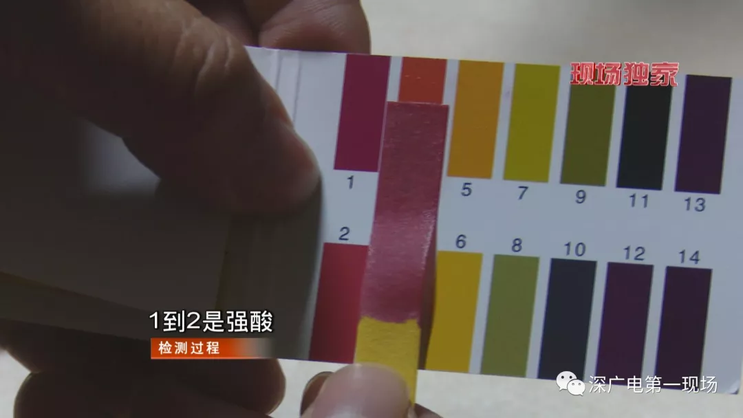 记者在地面上提取了一些废弃液体,经过PH试纸检测,酸性数值在1到2之间。也就是说,这些液体呈强酸性。