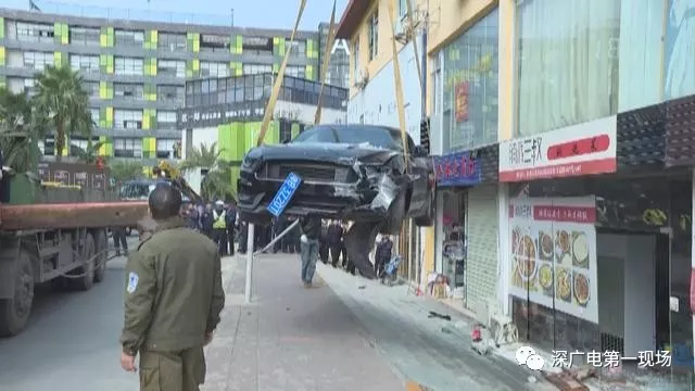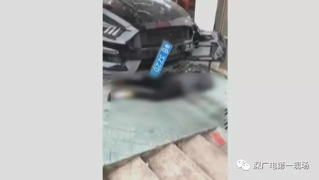 深广电第一现场2019年1月22日讯 21日早上8时12分,龙岗区横岗街道力嘉路109号附近有一辆黑色福特野马轿车突然失控冲向人行道撞倒数名行人后越过阶梯,撞停在一家餐饮店门口。其中,一名女子被撞不幸身亡,记者在现场看到了女子的丈夫,他告诉记者,就在事故发生前几天,妻子还说要一起回老家过年的。