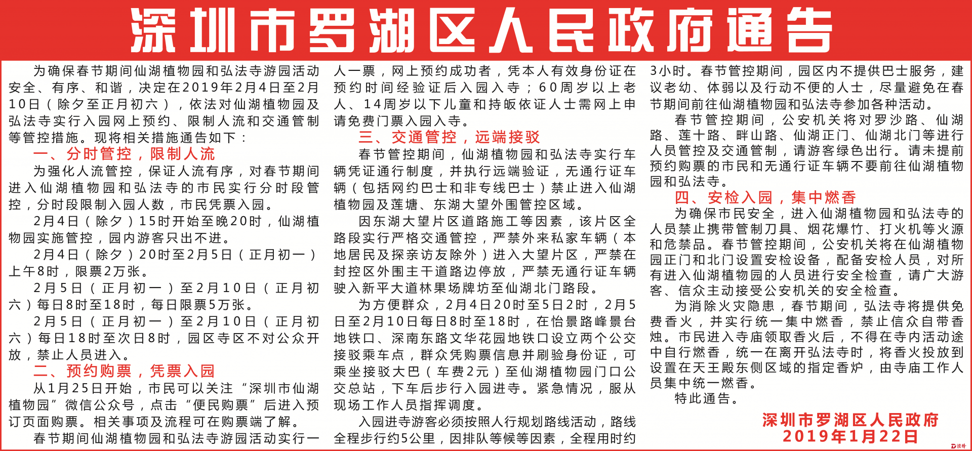 深圳特区报2019年01月22日讯 春节临近,许多市民对今年春节期间仙湖植物园和弘法寺游园活动的相关安排非常关心。1月22日,罗湖区政府就此发布了正式通告。