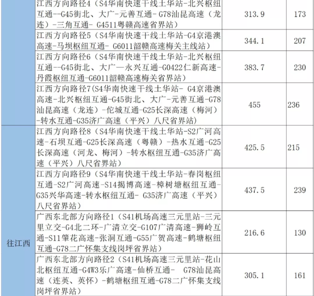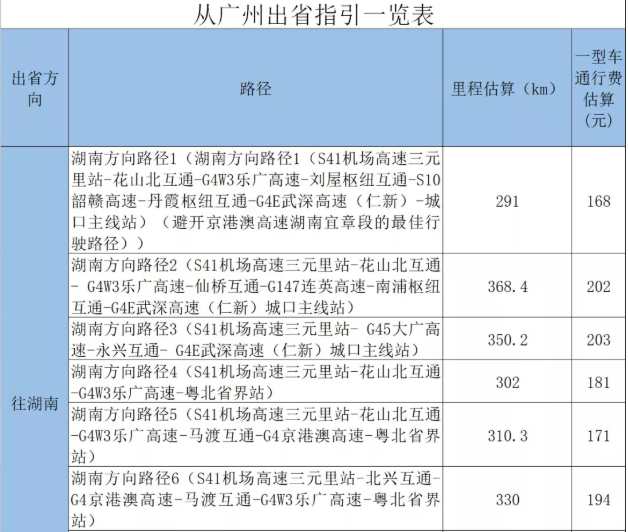 从广州出发,通往湖南、广西东北部、江西、福建、广西北部湾及海南方向的出行指引: