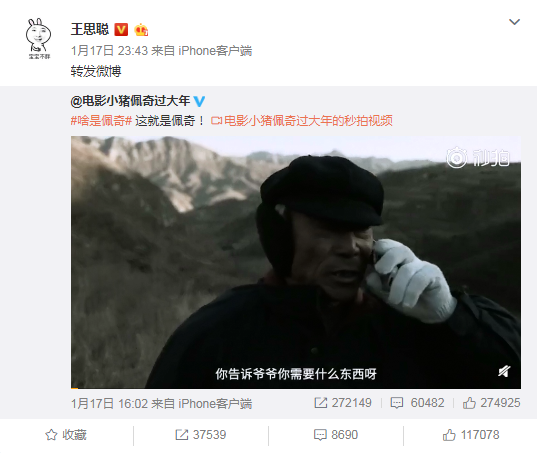 王思聪转发《啥是佩奇》宣传片的微博截图
