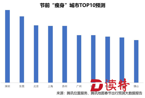 《报告》首次用“瘦身”这一概念来描述某个城市在春节前期的人员净流出状况,也就是用该城市的迁出数据减去迁入数据,从而得出“瘦身”指数。10大最“瘦身”城市中,深圳、东莞、北京荣膺前三甲,再次成为“空城”;而苏州超过广州、杭州,排名第五,令人意外,看来苏州的吸引力已不亚于北上广深杭。