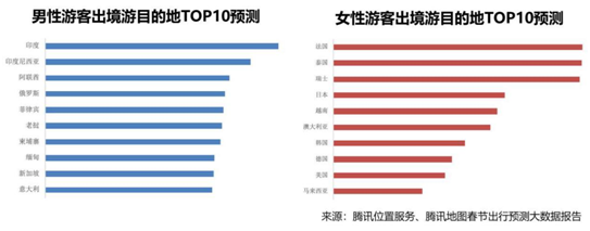 根据性别划分,女性游客最感兴趣的目的地是法国、泰国、瑞士、日本、韩国等国家,要么是浪漫之都,要么是购物天堂;而男性游客的兴趣则更为广泛,占比最多的目的地包括印度、印度尼西亚、阿联酋、俄罗斯、菲律宾等。