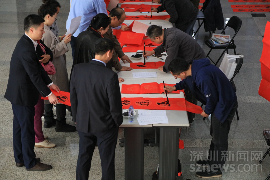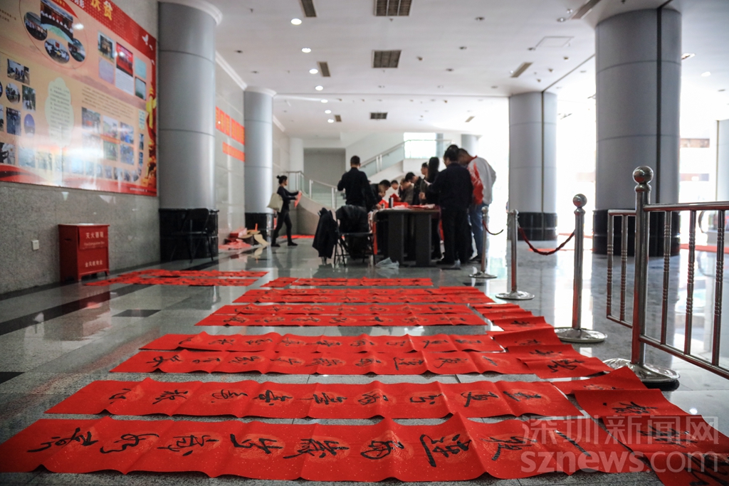过年贴春联,是中华民族的传统习俗之一。可以说,春联一出,年味十足。记者在深圳商报大厦一楼活动现场看到,工作人员早已准备好了春联的红纸和笔墨,多位书法了得的记者编辑挥毫泼墨,创作出了一幅幅寓意喜庆吉祥的对联,并免费赠送给同事。不少人为了能拿到新鲜出炉的春联,提前在现场排队等候。