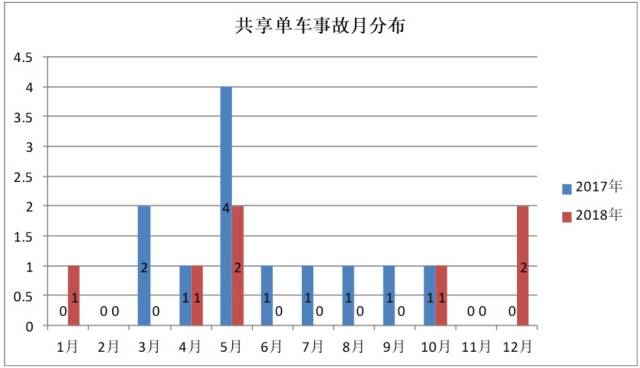 从事故多发月份来看,5月份是共享单车事故的高发月份,在2017年和2018年两年中,五月份均是死亡人数最多的月份。两年中,发生在5月份的事故死亡人数共6人,占总死亡人数的31.58%。