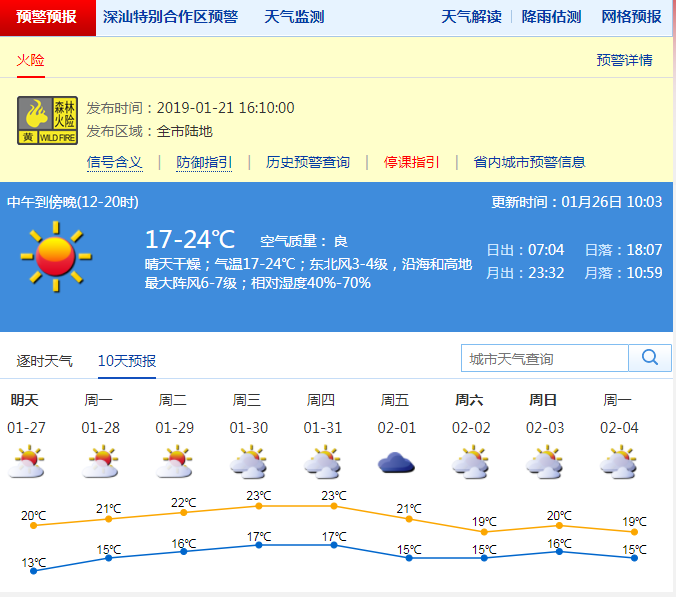 深圳新闻网2019年1月26日讯 今日气温17-24℃,晴天干燥,相对湿度40%-70%。深圳市气象局预计2019-01-27:晴天间多云,天气干燥气温:12-20;2019-01-28:晴天间多云气温:15-21;2019-01-29:晴天间多云气温:16-21;2019-01-30:多云气温:17-22;2019-01-31:多云气温:17-23;2019-02-01:阴天间多云,有零星小雨气温:15-21;2019-02-02:多云气温:15-19;2019-02-03:多云气温:16-20;2019-02-04:阴天间多云,有分散小雨气温:15-19