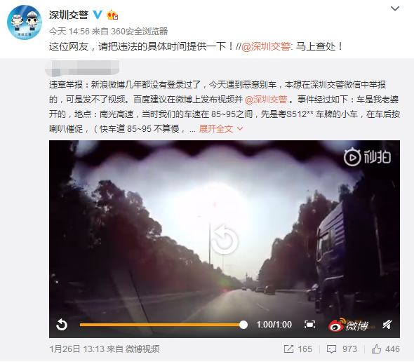 1月28日下午3点,深圳交警在微博回复该网友称马上查处,并希望爆料博主能提供具体的时间。