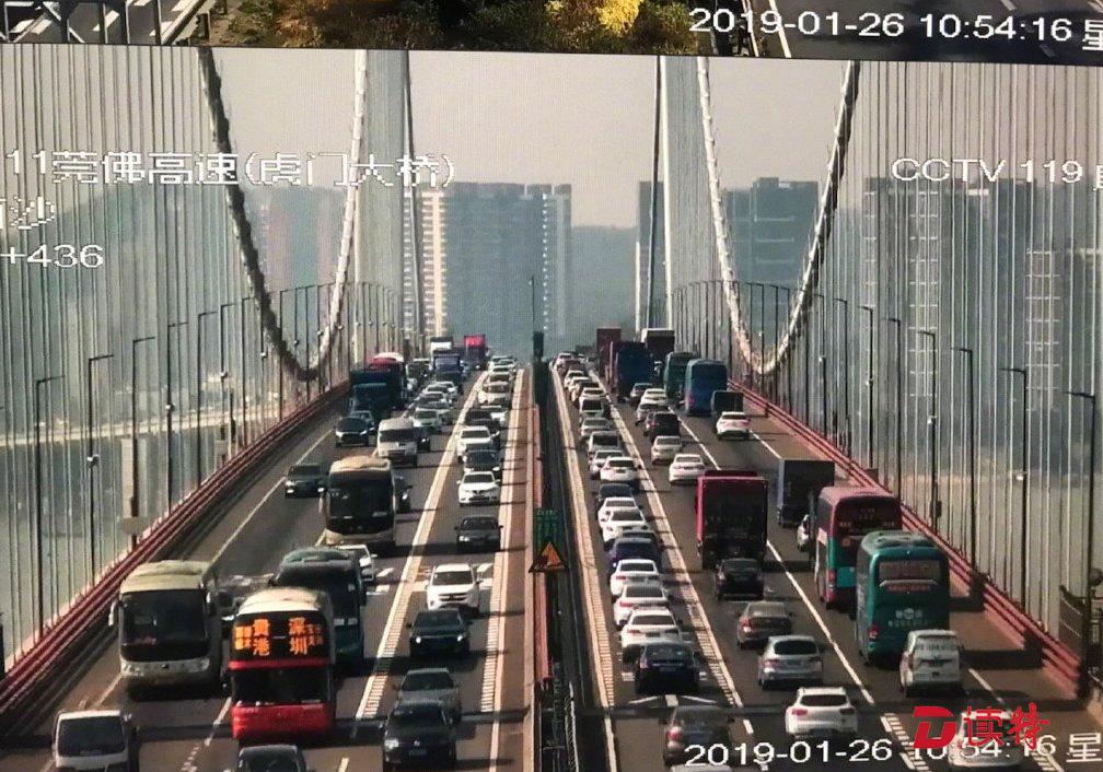 26日下午2时许,记者来到广深高速新桥收费站,在现场可以看到车辆已经排起了长龙,虽然行驶速度比较缓慢,但总体来说还算平稳。记者了解到,从早上8时开始,广深高速就出现了自驾返乡车流,平均每小时经过的车流达到近300辆,明显高于平时。尤其是广深高速虎门大桥路段总体车流量较大,由于春运期间学生放假、务工人员返乡、春节探亲旅游等叠加,预计虎门大桥春运日均车流将会达到13.1万辆,同比上升1.5%。“一旦出现交通严重拥堵的情况,广深高速新桥路段将进行交通管制。”西部高速交警大队民警周楷泽介绍。交警部门预计,虎门大桥本月30日拥堵将达到高峰,拥堵时长将达20个小时。