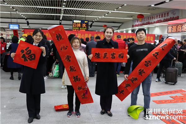 日前,深圳火车站在小年日子里送“福”,为旅客们送上一点新春温暖。现场,10名来自深圳职业技术学院的春运志愿者在稀稀拉拉的人流中集体亮相。伴随着欢快的律动,同学们脸上洋溢着灿烂的笑容,上演一支活力四射的齐舞。候车室的旅客纷纷闻声而来,驻足观看。一时间,候车室内热闹非凡。原来,这是深圳火车站为了给返乡旅客送上新春祝福,专门联合广铁集团文联、南湖街道团工委、民乐志愿者协会组织开展的“小年送‘福’,情暖旅途”活动。