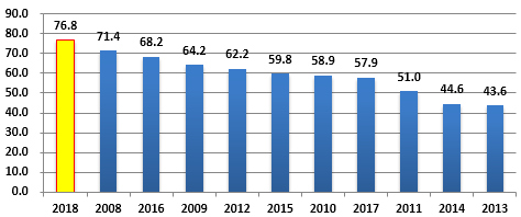 根据全市区域自动气象站台风风雨影响综合年景指数计算结果,2018年台风风雨影响综合年景指数达到76.8,成为2008年以来最严重的一年,超过2008年的71.4。
