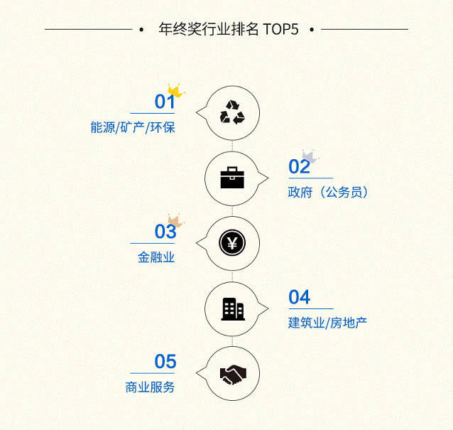能源/矿产/环保行业在年终奖行业排名中位列第一。报告显示,全国年终奖行业排名前五分别是:能源/矿产/环保、政府(公务员)、金融业、建筑业/房地产和商业服务。
