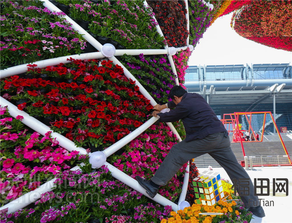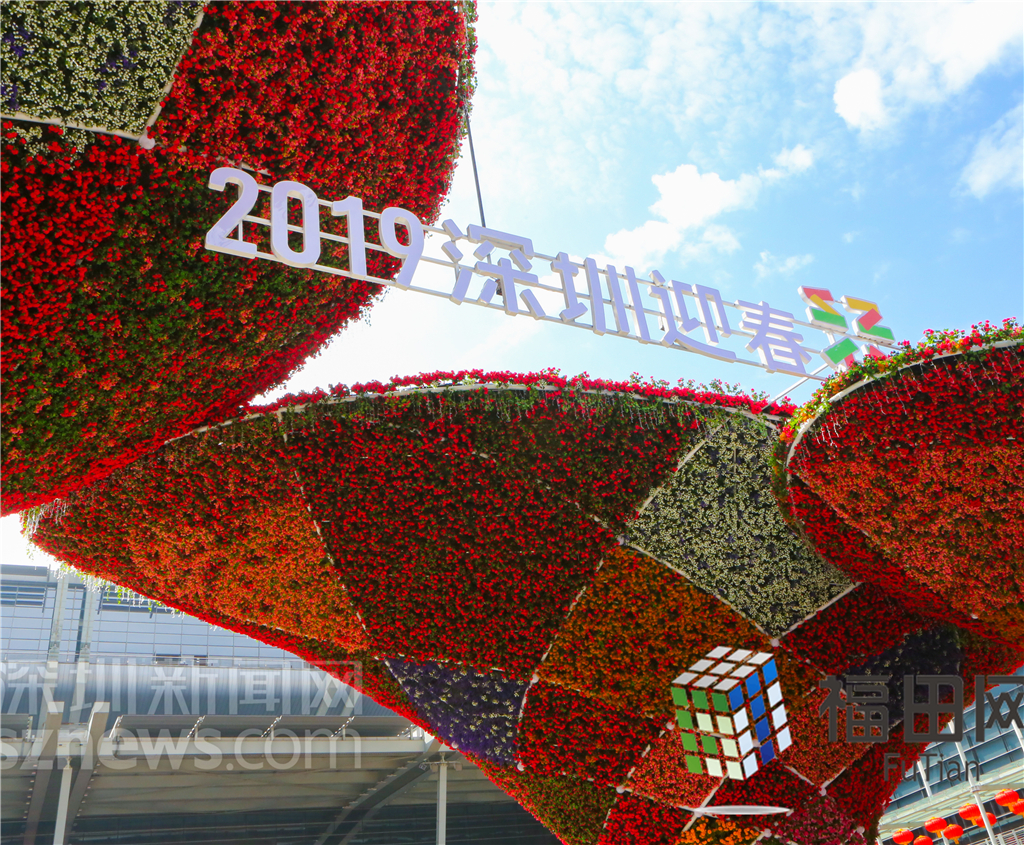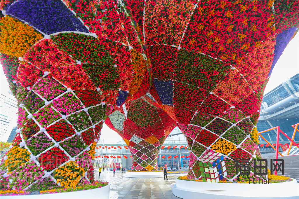 在会展中心门口,首先映入眼帘的便是一座高15米,宽40米的迎春花市门楼。记者了解到,该门楼本身就是一件花卉艺术作品,主题为——花开鹏城。以盛开抽象的花形为设计元素,采用流畅的交织曲线并结合七彩花卉,打造一种花开鹏城的韵味,突出迎春花市的气息。