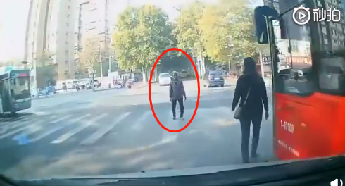 老太太走到小车正前方时却突然停下脚步,紧接着缓缓卧倒在地。