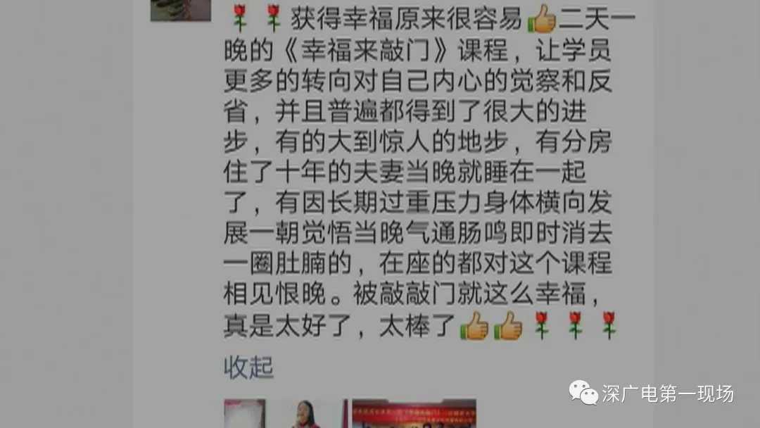 李先生说,价格虽然有点儿高,但如果能够让妻子变好,那也无话可说,然而妻子参加完后面课程回来以后,像是被洗脑了一样。他偷偷看妻子的微信群,都在谈论课程有神奇的效果,有人在朋友圈推销说:听了课程之后,分房住了十年的夫妻当晚就睡在一起。