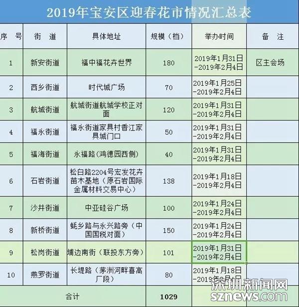 石岩、燕罗、沙井、新桥、西乡街道迎春花市分会场已开市,宝安福中福花市主会场与航城、福永、福海、松岗街道分会场于1月31日开市。