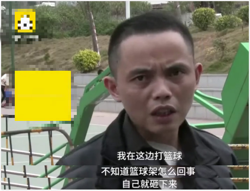 据何先生回忆,当时他正在打球,篮球架不知何故,"自己就砸下来",导致其当场昏迷、锁骨骨折。从现场拍摄的视频中可以看到,倒塌后的篮球架框严重变形,幸好与其一同打球的三四个球友合力将他从篮球架下抬出来,并拨打了120。