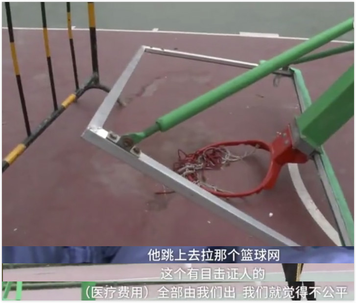 何先生认为造成这起事故的主要原因是施工方的疏忽,未将篮球架有效固定,因为倒塌的这个篮球架底座并没有打钢钉,填充物也仅有两块水泥砖,并不牢固。对此,球场施工方表示,工程验收时"百分百 OK",愿意出于人道主义关怀给予伤者适当补偿,但拒绝支付全部医疗费,因为"他跳上去拉那个篮球网,有目击者的"。