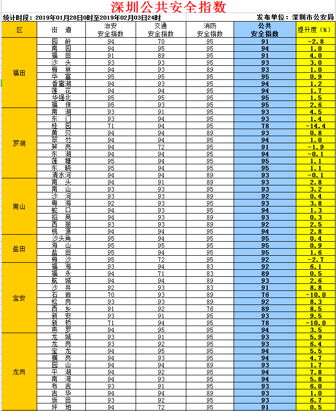 深圳新闻网讯 深圳市公安局围绕市委市政府“城市管理治理年”工作部署要求,借鉴国内其他城市的成功做法,于2016年4月5日开始,每周通过《深圳特区报》、《深圳新闻网》、市公安局门户网站、公安微信、微博,向社会发布一次深圳公共安全指数,保障市民群众知情权、监督权,引导社会各界广泛参与“平安深圳”建设。