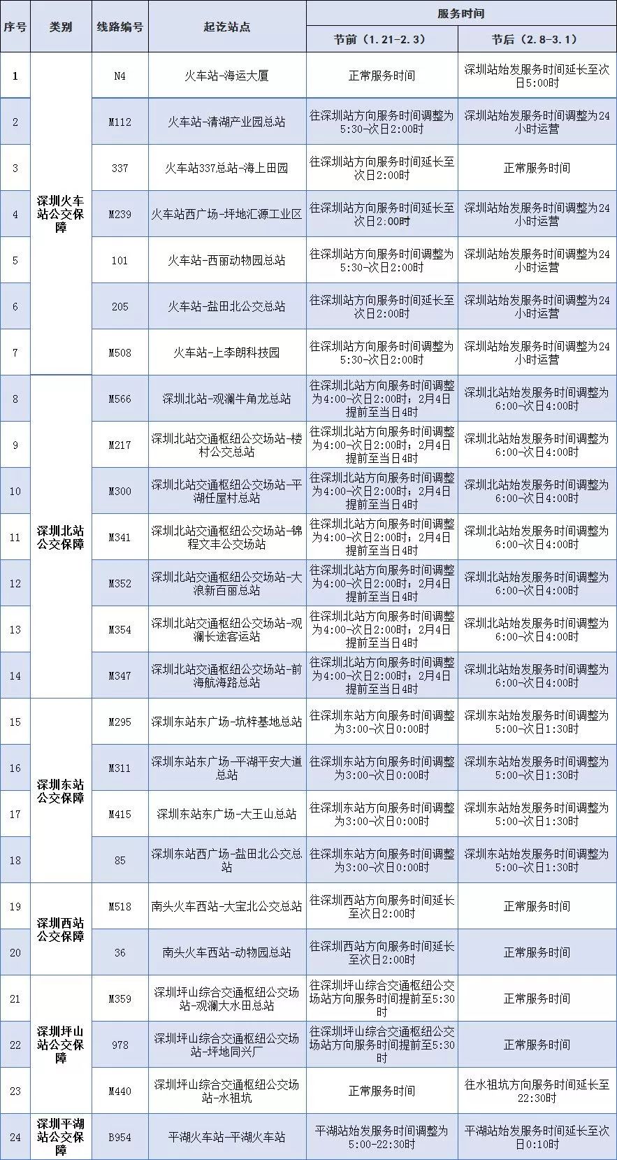 ③ 为方便半夜抵深的旅客顺利坐车回家,深圳北站、深圳火车站等多条公交线路通宵运行,深圳西站、东站、深圳站和福田站还开行春运专线,深圳机场公交也延长运营时间,返深旅客不用担心半夜到站没有车坐。