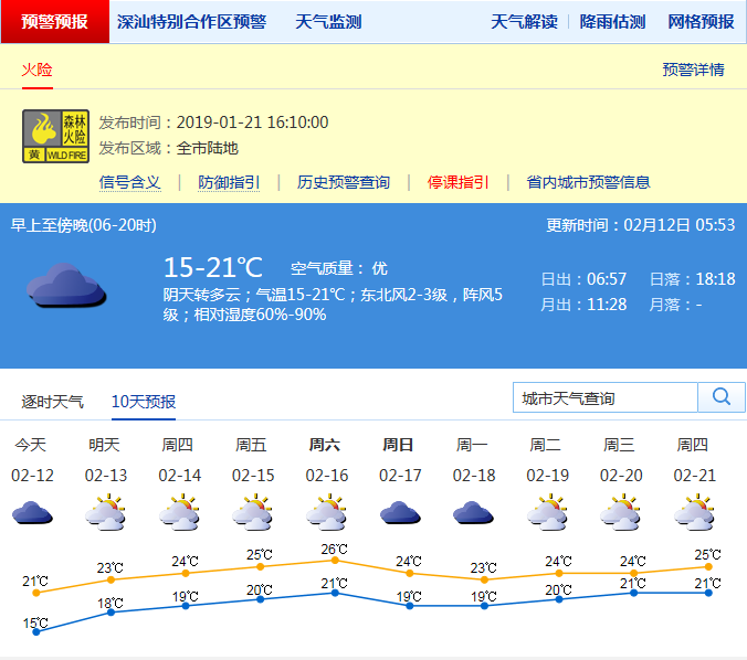 记者从深圳市气象局了解到,昨日受冷空气影响,早晨最低气温在14-16℃,较春节假期明显变凉,因为云量较多,白天气温在17℃左右徘徊;预计12日起冷空气逐渐减弱,气温逐日上升,早晚能见度逐渐转差,气温在15-21℃;15-16日多云间晴天,早晚有轻雾或雾,中午前后较热;17-18日弱冷空气影响,有分散小雨,气温下降,沿海和高地阵风7-8级。