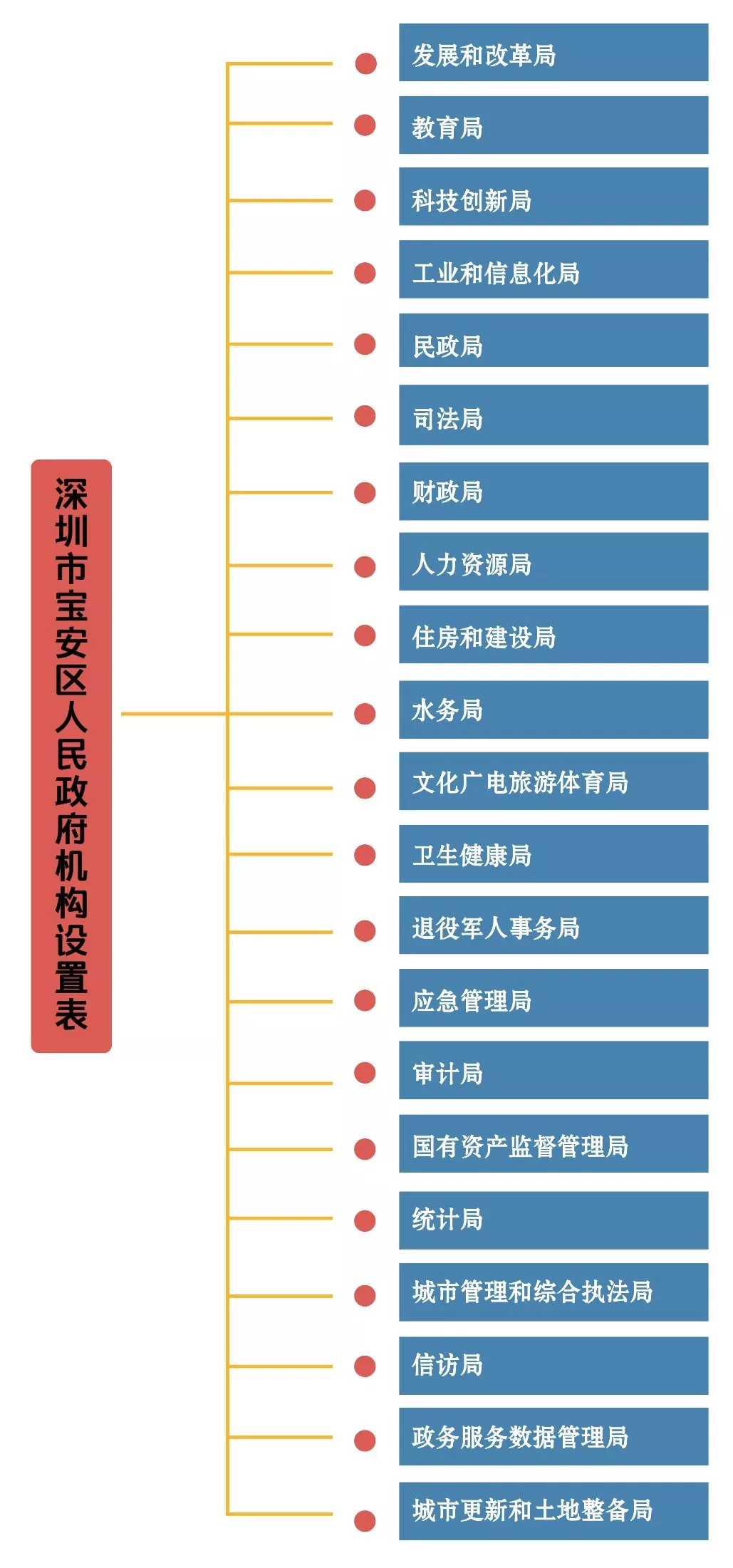 说明:深圳市宝安区人民政府设置工作部门21个。其中,工业和信息化局挂商务局、金融工作局牌子;住房和建设局挂人民防空办公室牌子;国有资产监督管理局挂集体资产管理局牌子。办公室与区委办公室合署办公,不计入机构限额;民族宗教事务局列入政府工作部门序列,不计入机构限额。