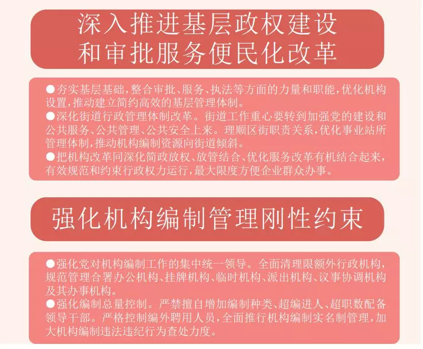 二是践行以人民为中心的理念。在政务服务、退役军人事务、卫生健康等领域组建相应的新机构,更好推动公共服务、社会管理各项事业发展,加大力度保障和改善民生,努力解决居民群众最关心最直接最现实的利益问题,更好满足人民日益增长的美好生活需要。